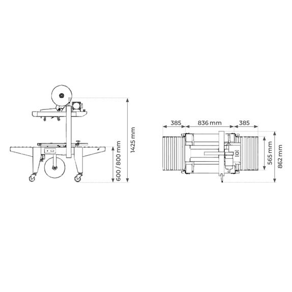 Полуавтоматичната машина за затваряне на кашони е с четири захранващи ремъка, два отгоре и два отдолу, които уплътняват горната и долната част на кашона. Този уплътнител за кашони е особено подходящ за високи или нестабилни кашони. Операторът разпъва кашона, сгъва долните капаци, вкарва я в центриращия/задържащ модул, където кашона може да се напълни, без да се налага да го държи с ръце, сгъва горните капаци. След това той го насочва към машината, която активира микропревключвателя на горната лента, която пада в горната част на кашона. Докато кашоните минават през машината, горният и долният капак ще бъдат запечатани от залепващите глави едновременно. Машината включва захранващи централни ролки, изходни ролки и колела, представляващи практична и проста опаковъчна станция.
